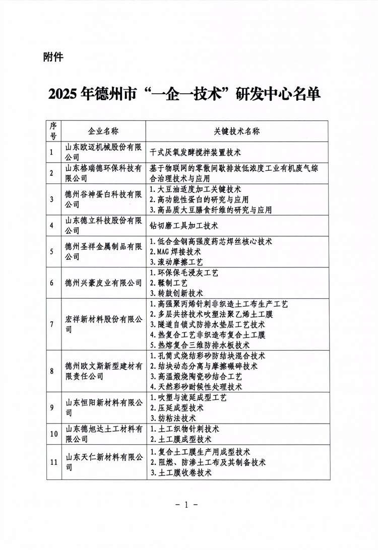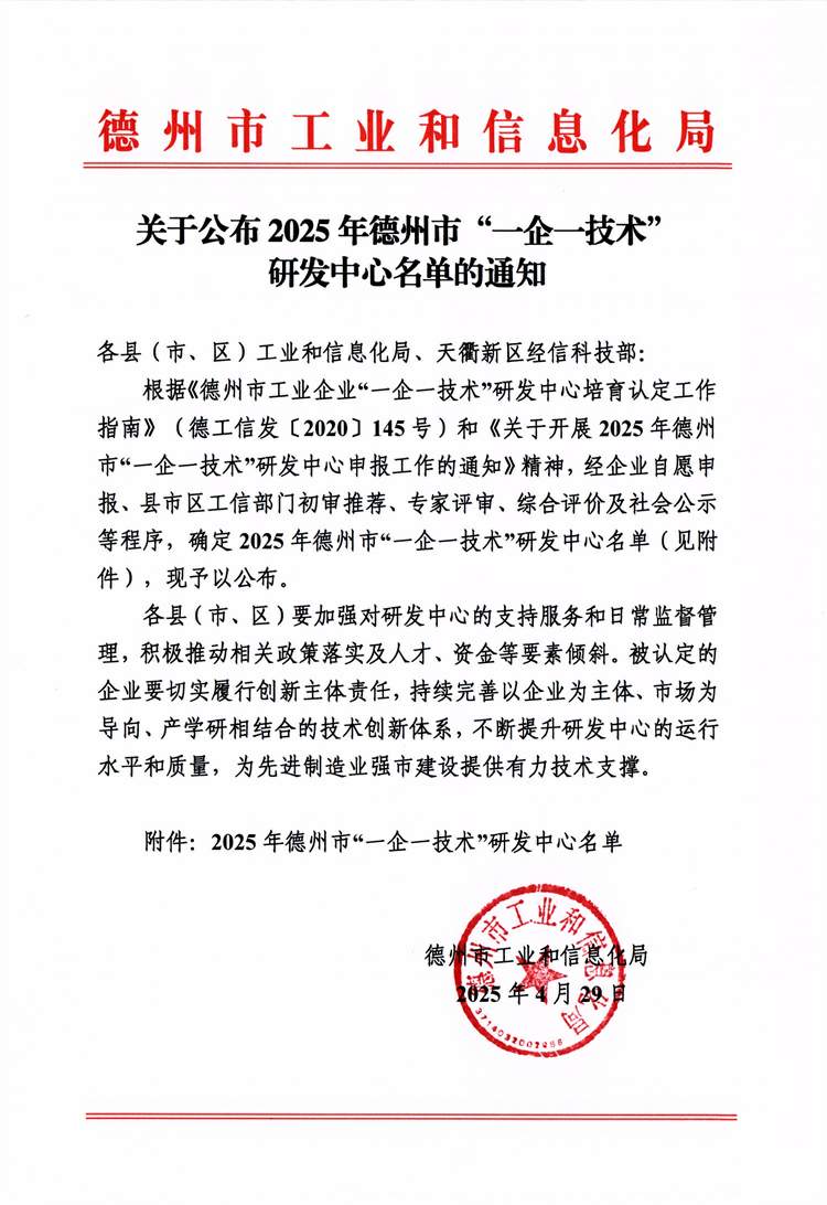 關(guān)于公布2025年德州市"一企一技術(shù)"研發(fā)中心名單的通知
